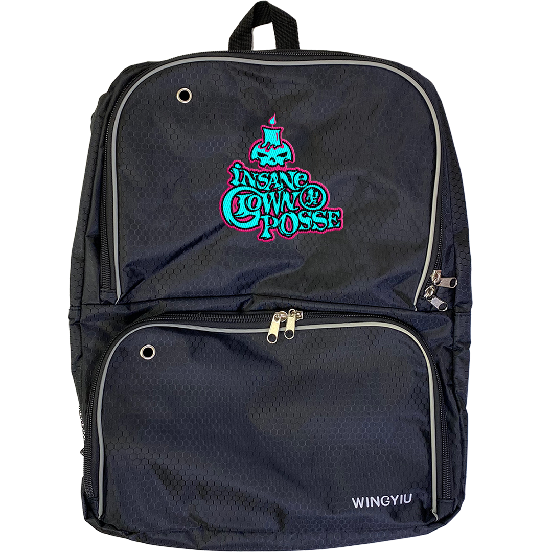 A high quality nylon backpack in black with Insane Clown Posse "Shangri-La Stack" graphic embroidered on the front. Features zipper enclosures, multiple pockets, padded back, and buckled straps.